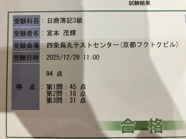 本日は京都で簿記3級を受験しました。70点が合格ラインで、合格率は40%前後ですが、かねてより私は90点以上での合格を公言していました。その結果は・・・94点、もう少しできると思ったのに・・・